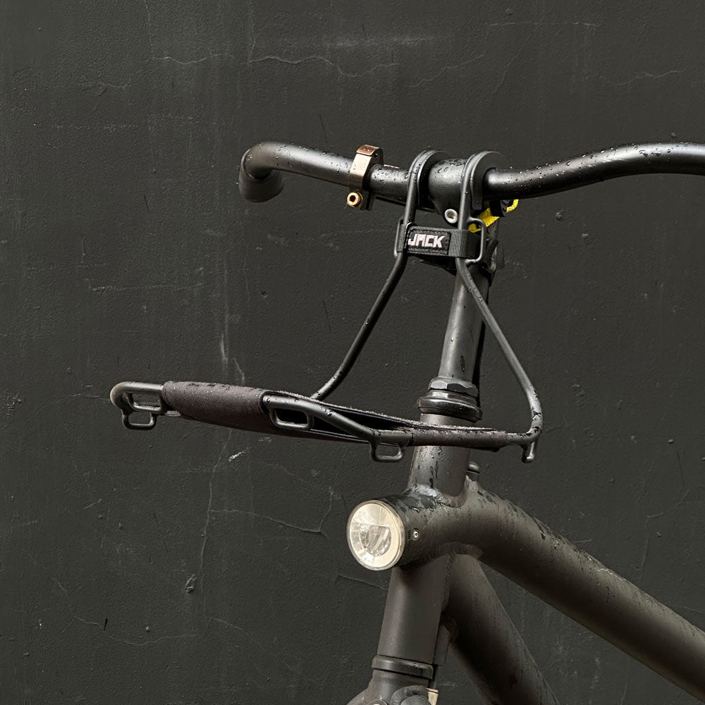 JACK is a universal-fit* front bicycle rack that securely straps to almost any bike, offering a straightforward solution to carrying your things with you while you ride. A ‘Rack of all Trades’, JACK fits to your bike with a tool-free strap system, requiring no special bicycle frame or fork, no specialist equipment and no bike maintenance skills.